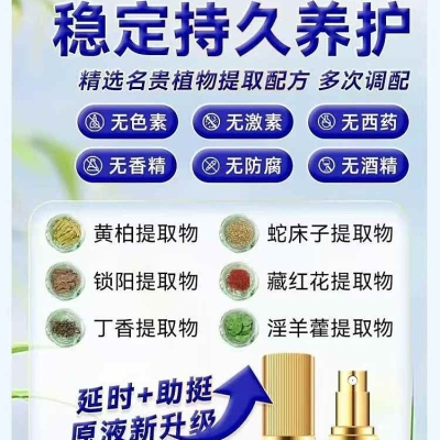 深度滋养:精选延时助勃精华,均衡配比,高效渗透温和滋养,降低私处敏感,缓解房事疲惫无力,延长房事时间,硬挺长效作战